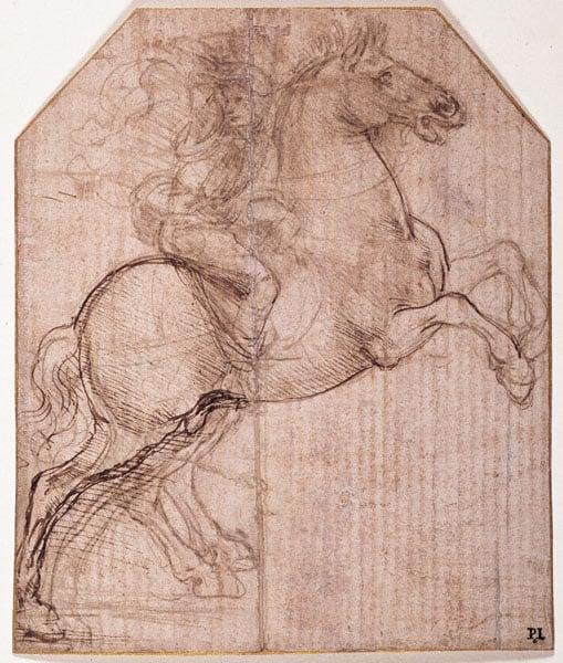 Depicts a profile view of a rearing horse with a seated rider. Probably a study for a rearing horseman who appears in the background of the painting 'Adoration of the Magi' now in the Uffizi, Florence. His abstracted and dreamlike gaze contrast with the dynamism of the action in the finished work.