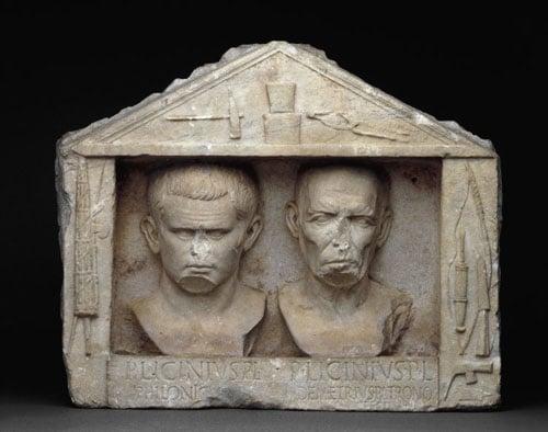 A relief representing two freedmen of a Publius Licinius, who from their names, Philonicus and Demetrius, seem to have been Greek. Not a tomb relief, but looks like one. Two styles of portraiture; the older man in the old-fashioned realist Republican style, the younger (who may be his son) in the idealised style of the time of Augustus or Tiberious.