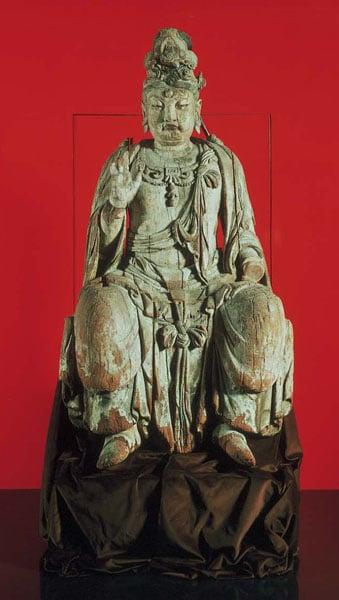 The Bodhisattva, a popular and powerful figure in Chinese Buddhist iconography, is a saintly figure of Mahayana Buddhism who elects to stay in contact with this world to help other mortals to reach Nirvana. The present figure is seated with legs pendant and the right hand raised, with the forefinger pointing upwards and the palm facing forward, symbolizing teaching. The left hand, which is missing, would probably have lain palm upwards on the left knee. It appears to have been painted from the beginning, and in its present state is more subdued in colour than it has been at anytime in the past.