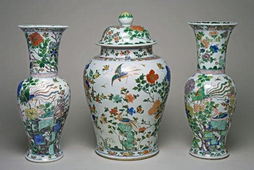 Five porcelain vases, three covered jars and two beakers, painted in brillaint 'famille verte' enamel.