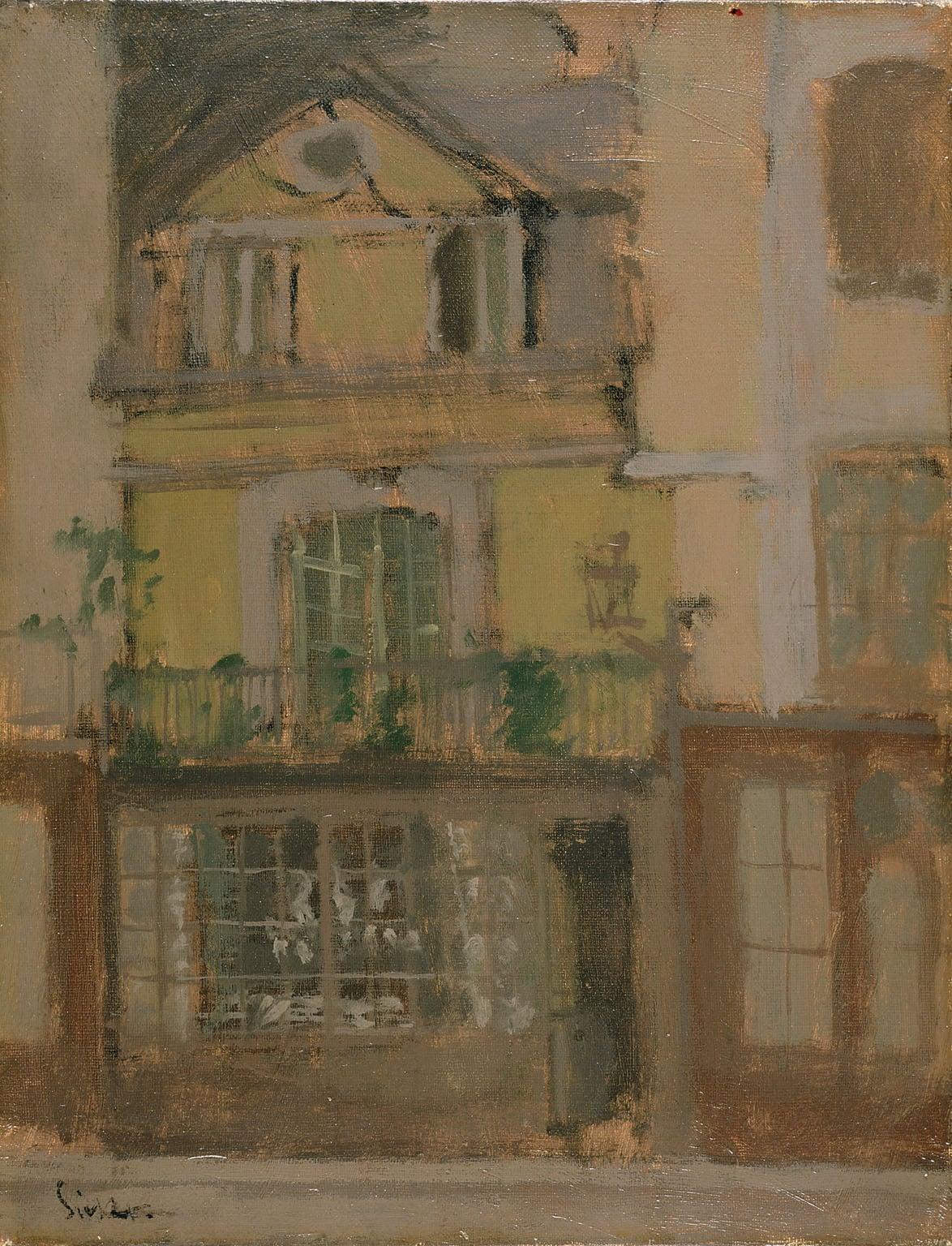 This depicts a shop front near the Place St Jacques, Dieppe. Though very characteristic of Sickert's work in Dieppe, it inherits much from Whistler in choice of subject and tone values.