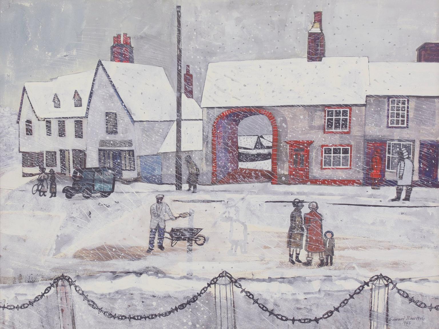 A Snowy Day, High Street, Great Bardfield, Essex is a wintery scene by Bawden of the village’s snow-covered high street. Villagers are passing through, catching up with neighbours, and one man is clearing the heavy snowfall with a shovel into a wheelbarrow. They're all wrapped up in coats and hats to fend off the cold.
