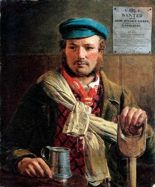 The work addresses two burning issues of the day: the Crimean war and the plight of agricultural workers. Collinson portrays a labourer sitting in a pub, tankard in hand, contemplating joining the 'Army Works Corps'. The corps was formed in 1854 to encourage rural workers and navvies to volunteer as civilians in the Crimean war.