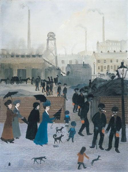 Oldham's two key industries, cotton spinning and engineering, relied heavily on coal and there were four large mines in the town in the early 20th century. Oldham is literally built on coal as well and this painting shows how close the pitheads were to built-up areas.