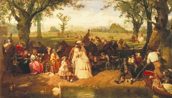 A Frith-like crowded Victorian genre painting with much detail; the scene shows the Serpentine and the distant architecture of Marble Arch and Park Lane. Signed and dated 1858.