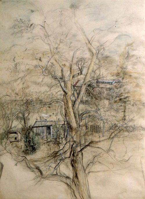 This drawing is one of a number that David Jones made from the window of his room at Northwick Lodge, Harrow. As so often in his work, he was keenly aware of the mystical connotations of the image, in this case the relationship of the tree to the Crucifixion. The artist's stay at Northwick Lodge brought him into contact with Harrow School, several of the masters being his fellow lodgers.
