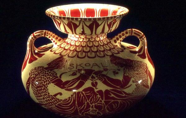 Gourd-shaped, decorated in amber lsutre glaze, with maidens and foliage. An example of the art pottery made by Maw and Co.