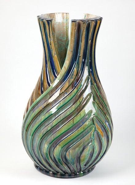 Kate Malone is known is known for her bold and striking creations and her use of shapes inspired by all forms of nature. The fennel is a new twist on her more familiar gourd shaped pieces. Perth has acquired this work to mark their commitment to contemporary collecting. Perth has a significant collection of Martinware and the museum is keen to explore the similarities between the two ceramic makers. Both are inspired by the natural world, organic forms and experiment with the idea of growth. Malone is well known for her colourful pot creations often in the shape of fruit, vegetables and fish. There are several examples of Edwin MartinÂ’s pots in the collection at Perth that personify nature in the same way including sea urchins, gourds, flowers and marine life. There are also parallels with the whimsical humour and playfulness of the pieces.