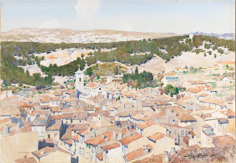 After his experience serving in the First World War, Cursiter’s style became more Realist. A View of Cassis, painted during a six-month trip to the French Riviera in 1920, reflects this change. The picture, one of a group painted by the artist in Cassis that year, shows the church and roofs of the Mediterranean port set against the dry summer landscape.