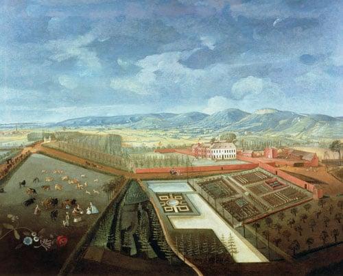 A panorama showing surrounding gardens, parks and woods, numerous local landmarks, and Cleeve Hill. Formerly thought to be by Robert Griffier, since re-attributed to Thomas Robins the Elder.