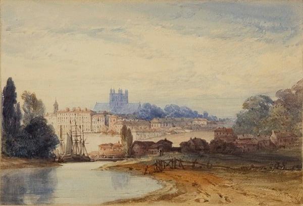 Prospect of Exeter with the River Exe in the foreground and Exeter Cathedral on the horizon.