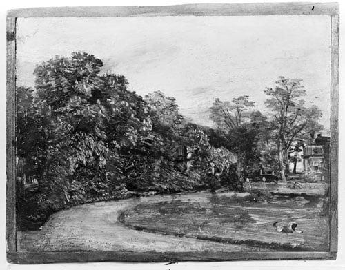 Constable's house at East Bergholt (the birthplace of the painter) painted from the garden. On the left is a clump of horse-chestnut trees in bloom, in the right foreground a dog lying on the lawn. Part of nine gifts to six museums by Victor Rienaecker through the Art Fund between 1923 and 1928.