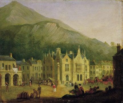 The marketplace is seen with Castlebergh Rock as a backdrop. The Town Hall is seen in the centre of the painting with the Fountain beside it. Figures mill about the marketplace and a carriage with horses enters from the right.