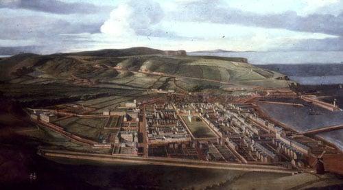 Situated on the north-west coast of Cumbria, Whitehaven was the third largest town in the north, after Newcastle and York by the later 18th century, and, as a port, second only to London in the whole country. The driving force behind its expansion was the Lowther family, particularly Sir John Lowther, a man of wide culture and enlightened views who was responsible for developing the port and laying out the town on the grid system which is seen in the picture The painting is a scrupulously accurate record of this rapidly expanding town and is of great interest topographically.