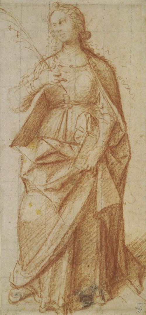 She stands facing the front, holding a palm in her right hand, and a book in her left hand, with which she also supports her drapery.