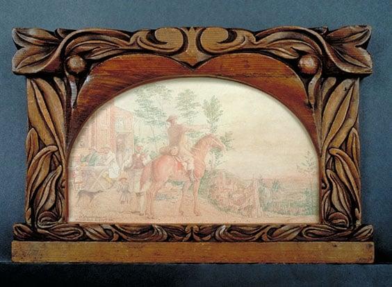 Richard Dadd spent over forty-two years in Bethlem and Broadmoor Hospitals. This is a superb example of a technique which Dadd refined and perfected during his time in hospital. The whole picture is stippled with the point of the brush in microscopic specks of soft colour, so insubstantial that sometimes it seems to be painted on gauze, yet so precise and sharp that every detail is seen with hallucinatory clarity. The subject is unexpected and appealing, combining an English country inn on the left and Mediterranean landscape with an exotic, if slightly improbable, hill town on the right. These are held in perfect balance by the elegant horse which gazes out across the distant plain while its rider turns back towards the group behind him. Dadd shows himself a master of design, but in this work he achieves such easy naturalism, particularly in the drawing of the figures.