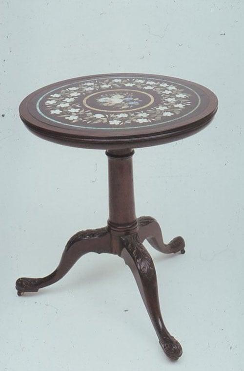 Mahogany, the top circular, inlaid with black marble with floral decoration in scagiola, on pillar and tripod base.