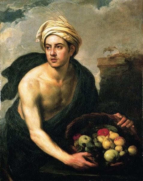 Three quarter length depiction of a youth holding a basket of fruit. His right arm and part of his chest are bare and ears of barley protrude from his turban.