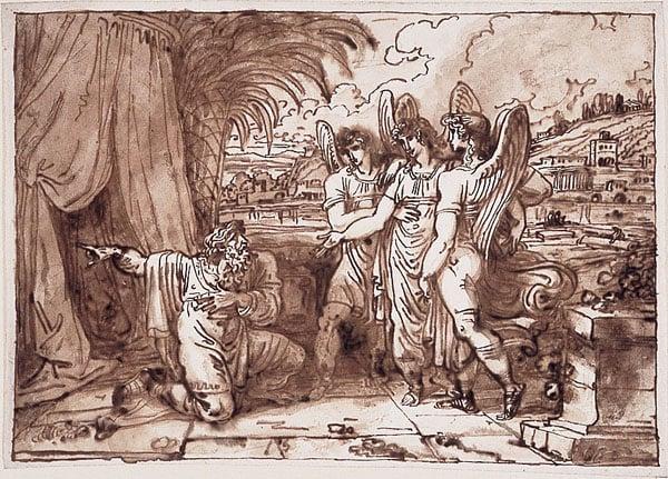 Abraham is pictured kneeling and pointing back towards a tent behind him. Three angels stand in front of him, one gestures towards Abraham. In the background is a landscape with a town nestled along a hillside.