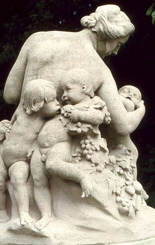Dame Nature nourishing some putti who are also enjoying the fruits of mother earth. Hopton wood stone on a base of Portland stone. Currently located in the rose garden and covered in winter.
