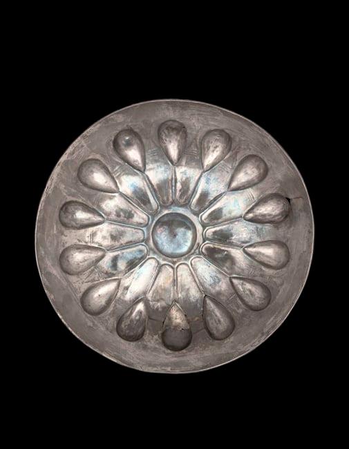 This silver display bowl is one of three found in the Mazanderan province of northern Iran during the late 1920s or early 1930s. It is a beautifully crafted object, decorated with fourteen radiating lotus stamens, with the petals chased on the underside. The use of this pattern shows influence from ancient Egypt, but the shape and design are distinctive of metal bowls made by artists of the Achaemenid Persian empire, which flourished between the 6th and 4th centuries BC.