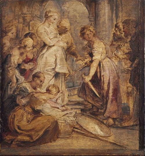 During the Trojan Wars Achilles, dressed as a woman, lived among the daughters of Lycomedes, King of Skyros. Ulysses and Diomedes disguised themselves as merchants and went to the court of Lycomedes in search of Achilles. They recognized him when he picked up a sword rather than the jewels which they were displaying to the women. This is an exciting work for the fluid manner in which the paint is applied. It is probably a sketch for the larger version in the Prado. The artist treated the subject again in the early 1630s in a series of designs for tapestries of 'The Life of Achilles'.