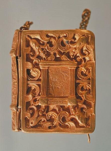 Agnus Dei reliquary which contained pellets of wax from a Paschal candle, mixed with holy oil, as a luck charm. Some of the pellets were still in it when it was found on the sea bed. Part of the finds from the Girona wreck. Purchased after a public appeal by the museum.