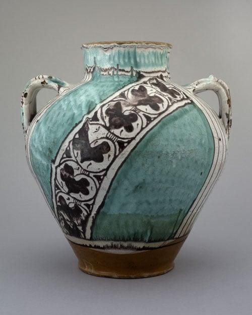 Pharmacy jar of irregular form, resembling an albarello with an unusually high neck. The body is almost cylindrical, though a little wide at the top than the bottom. Painted in manganese and bottle green, the body divided vertically into four panels, enclosing alternately a leaf and heart-shaped design. Probably made at Faenza. This work was donated by Max Rosenheim who presented over 170 works to the British Museum through the Art Fund between 1904 and 1911. Max Rosenheim was a financier and part of the Executive Committee of the Art Fund from its inauguration.