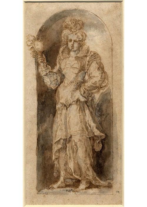 Allegorical figure of Pride in a niche. Crispin van den Broeck was the brother of Willem van den Broeck and known as a painter, draughtsman and engraver. He was commissioned by the Guild of St Sebastian (the young crossbowmen) to paint an altarpiece, and in 1582 he collaborated on the decorations for the State Entry into Antwerp of Francis of Anjou and contributed a painting of the Judgement of Solomon to the redecoration of the Stadhuis after its destruction in the ‘Spanish Fury’ of 1576. His drawings for engravings, including the illustrations for Plantin, are numerous and are mostly dated from the 1570s onwards. Taken from Grove Art.