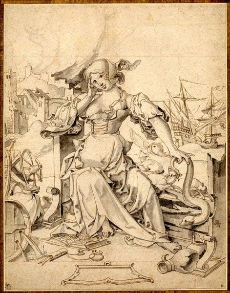 A drawing by a sixteenth century artist from Amsterdam representing an allegory of Idleness. The drawing depicts a woman holding an eel in her hand with ruins in the distance ruins. Behind the figure, we can see dying cattle and a ship. Originally thought to be an Allegory of Ill Fortune. One of thirteen gifts to five museums by J G Lousada through the Art Fund between 1921 and 1939.