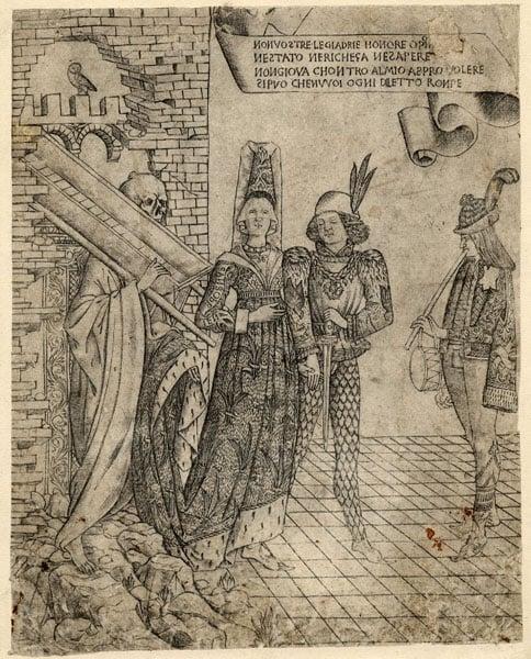 Florentine engraving of an allegory, a gallant and his mistress with a musician and Death carrying a coffin. The word Sansobrien on the lady's sleeve and four lines of verse in the corner.