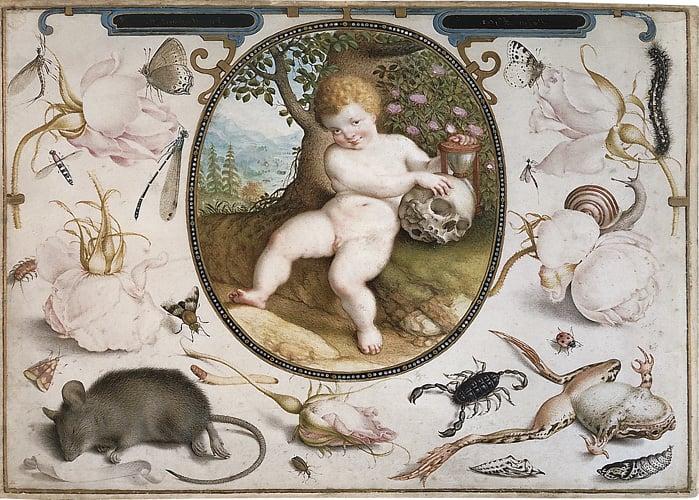 An oval panel depicting a child seated to the front surrounded by flora and fauna. This is one of 111 drawings bequeathed to the British Museum by Rosi Schilling in 1997. The majority of this collection of drawings formed by Dr Edmund Schilling was bequeathed to the British Museum through the Art Fund by his widow, Mrs Rosi Schilling, in 1993. Schilling was a former curator of the Stadelsches Kunstinstitut in Frankfurt, who emigrated to England in 1937. He was one of the few acknowledged specialists in this country on German graphic art, and built up his collection during the 1940s and 1950s in London when, Northern drawings were unfashionable and could be bought relatively inexpensively. His collection included drawings by major artists such as Hans Baldung and Lucas Cranach.