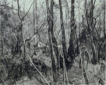 George ShawÂ’s paintings, etchings and drawings are rich evocations of place and memory. He paints and draws empty playing fields, pubs, bus shelters, lock-up garages and wooded hinterlands, all within about a half-mile radius of his old Tile Hill estate home. This large work demonstrates his exquisite drawing style and depicts a tangled wood at the edge of suburbia. It evokes a sense of desolation and dislocation, that universal undercurrent in contemporary urban life, a subject that Shaw has made his own. Southampton aims to collect works in different media by the same artist. This drawing will join Shaw's painting, 'Scenes from the Passion: The Unicorn', which depicts a deserted pub.