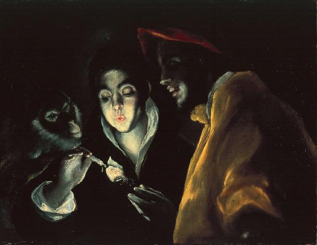 A boy blows on a burning ember between a man and a monkey. The meaning is obscure - allegorical, moral, or the recreation of a lost work from a classical text, ekphrasis. It is likely that the picture illustrates a Spanish proverb: 'Man is fire; Woman is tow; and the devil blows them into flame'. It certainly seems that Fabula contained some warning as to the consequences of 'playing with fire'. This painting has a lightness of touch and fluency of form. This work was acquired with assistance from the Wolfson Foundation.