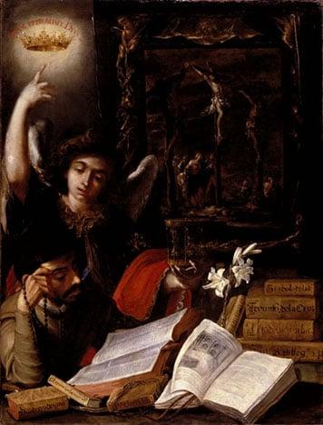The convert, holding a rosary, sits at a table covered with devotional books. Behind him, an angel points upward to a crown. The crown is encircled by Latin text and occupies the top left corner of the painting. This scene takes place against a background which is dominated by a painting of the Crucifixion. This painting was part of a collection of 117 works belonging to the industrialist and engineer F.D. Lycett Green and bequeathed to York through the Art Fund, in 1955, in recognition of the remarkable efforts made after the Second World War by its curator to transform it into a gallery of international importance.