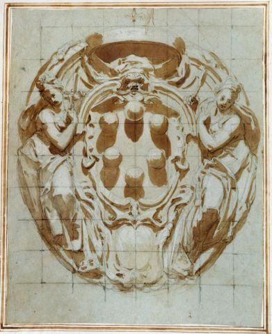 The Florentine artist Bernardino Barbatelli, known as Il Poccetti was a student of Michele Tosini and first employed to paint decorative grottesche on the facades of Florentine churches. This monumental design represents the Medici arms flanked by allegorical figures of Justice (with a sword) and Wisdom (with a mirror), surmounted by the grand ducal crown and a blank cartouche below. As the sheet is squared for transfer, it was evidently used, probably for an architectural stemma on the facade of a building, or possibly as part of a heraldic tapestry. This impressive composition is expressive of the emergence of the Early Baroque, and is directly associated with one of the principal Italian dynasties. It is the first work by Poccetti to be acquired by the V&A and was presented as a gift by the Art Fund (Max Hervey Bequest).