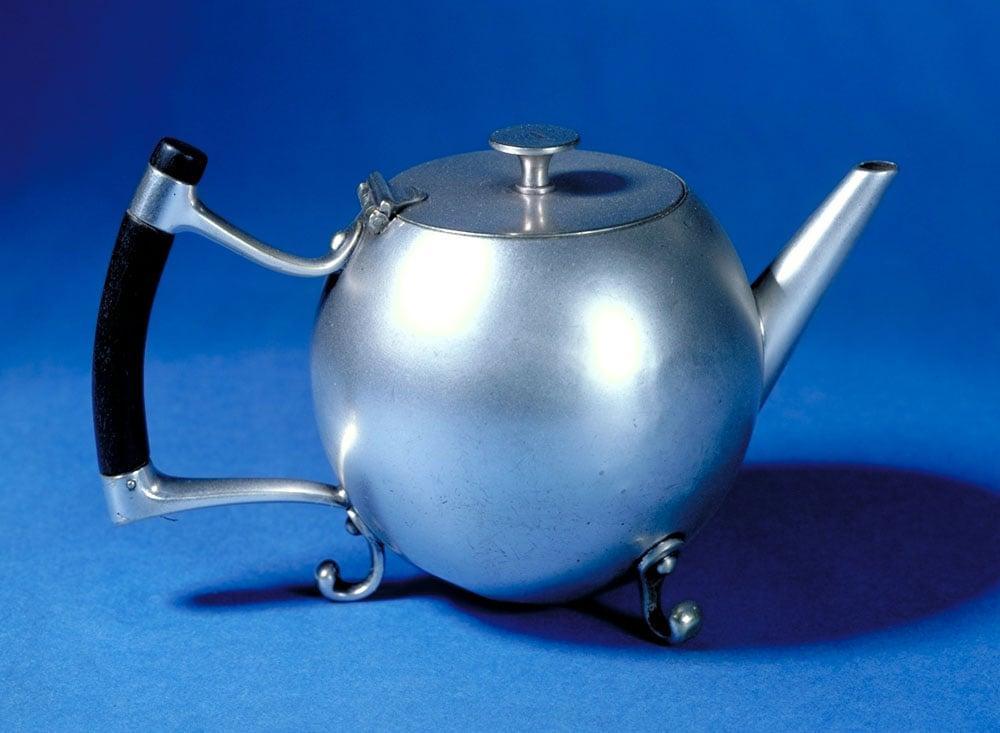 One of the most remarkable men of his day, Dresser was a genuine polymath. He trained as a botanist and lectured in this field before becoming a designer of metalwork, ceramics, glass and furniture. This handsome and completely unadorned teapot reflects many of his interests. The plain, geometric shape recalls the structural symmetry of plants and its bar-shaped ebonized wooden handle attesting to the impact of his visit to Japan in 1877. These features give the teapot a remarkably modern appearance. This teapot was made to Dresser's design by the firm of James Dixon and Sons, a member of the Art Furniture Alliance founded in 1880.