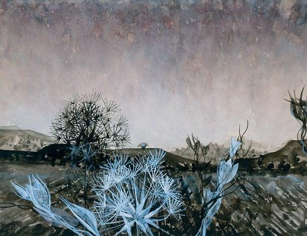 This watercolour is typical of the artists' early work which was inspired by Kentish landscapes. It depicts a landscape with stylised plant forms in gouache boldly applied in the foreground over transparent colour.