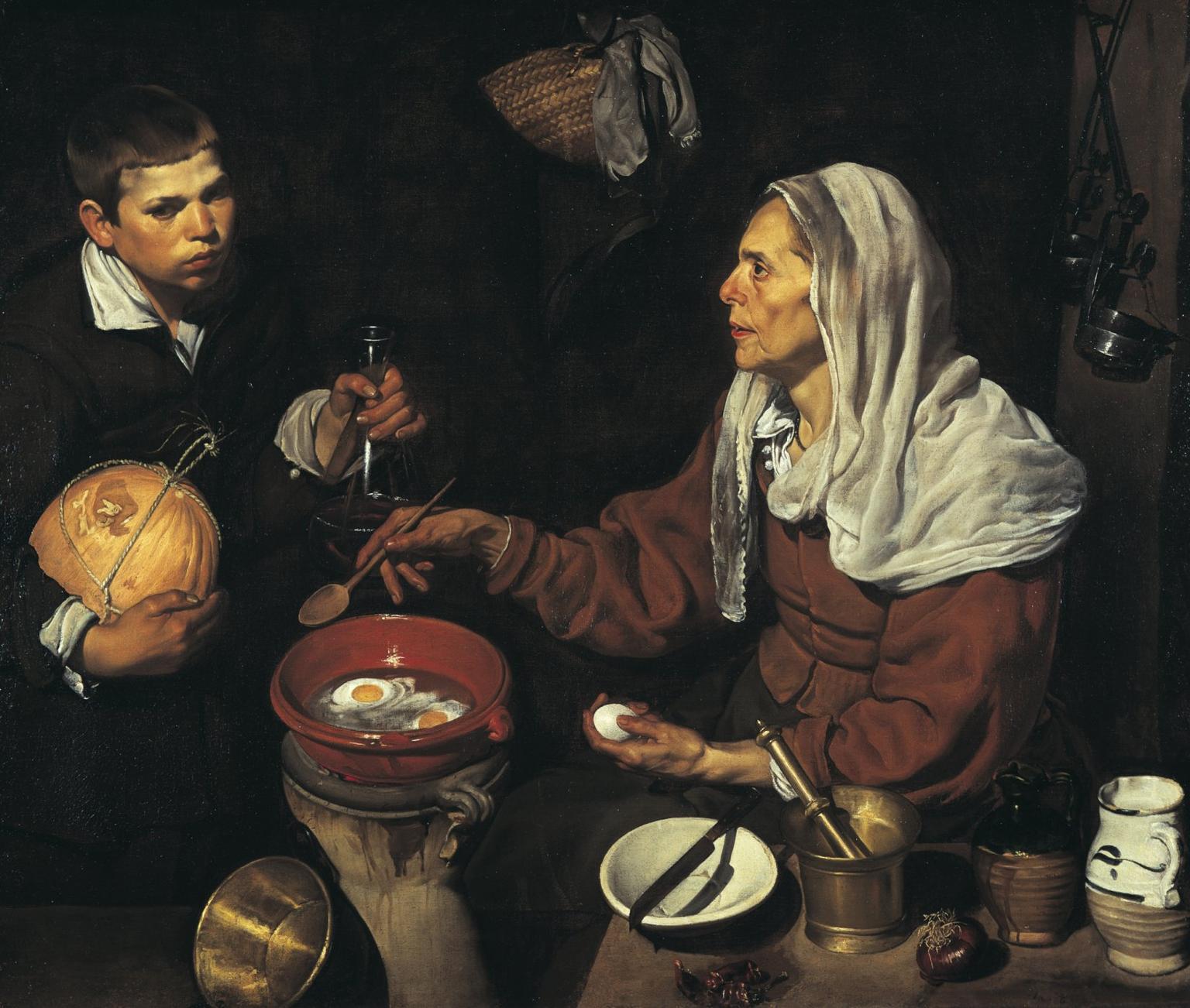 This kitchen scene or bodegon was painted from life models that appear as motionless as the objects. The painting belongs to Velasquez's earlier group of works, often genre scenes featuring figures and still-lifes and is part of a series of tavern and kitchen scenes painted in Seville prior to 1623.