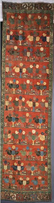 Anatolian rug of long narrow upright shape with houses, flowers and trees to represent a Mohammedan cemetery.