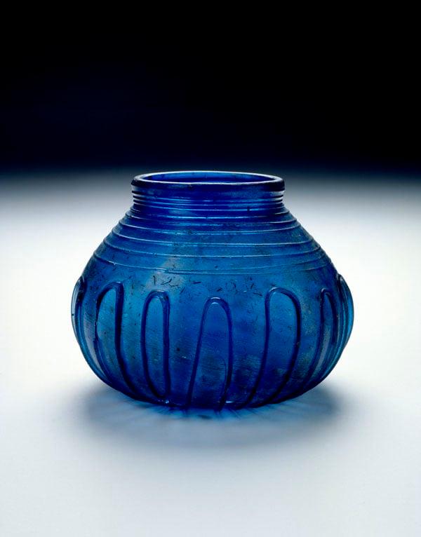 This bowl of royal blue glass is a great rarity and in perfect condition. It has been suggested that the Cuddesdon cemetery from which it comes is one of a group of princely graves of the late 6th and early 7th centuries, of which the famous Sutton Hoo ship burial is the most important. Dark blue glass seems to have been particularly prevalent at this period.