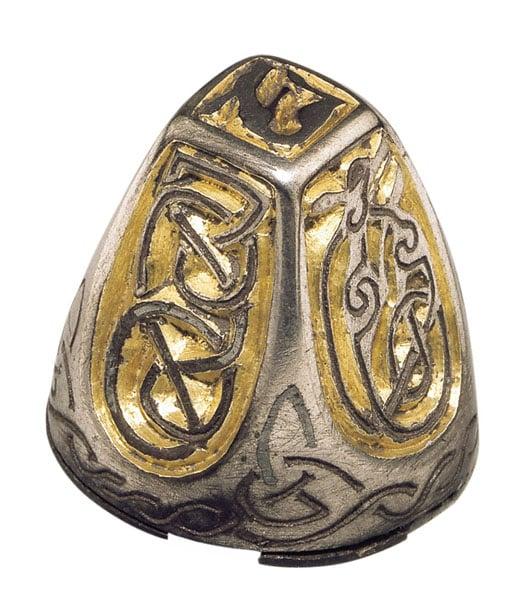 Pyramidal fitting with decorative detail in relief and inlay consisting of animal and interlace motifs.