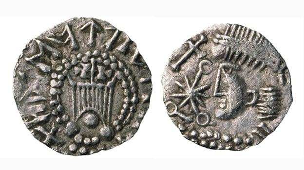 Bust with the shoulder and neck drapery indicated by pellets; hair dressed high on the head, a star-and-annulets device in front of the face, a latin cross above.