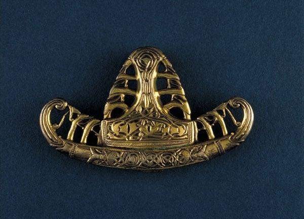 Sword pommel cast in two pieces riveted together. It is decorated on both sides with openwork friezes of animal heads, and with complex designs of interlacing animals, plant scrolls and knotwork.