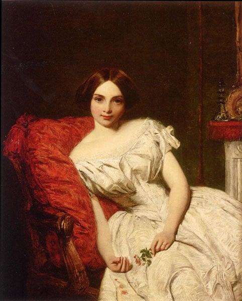 A portrait of Annie Gambart (1835-1870), who was the third wife of Ernest Gambart, the great Victorian art dealer and publisher. She married him in 1851 at just sixteen, half the dealer's age. Gambart seems to have indulged her every whim at first with beautiful clothes and jewellery. However in 1867 the couple separated and Annie went on to die of liver disease at the early age of 35.