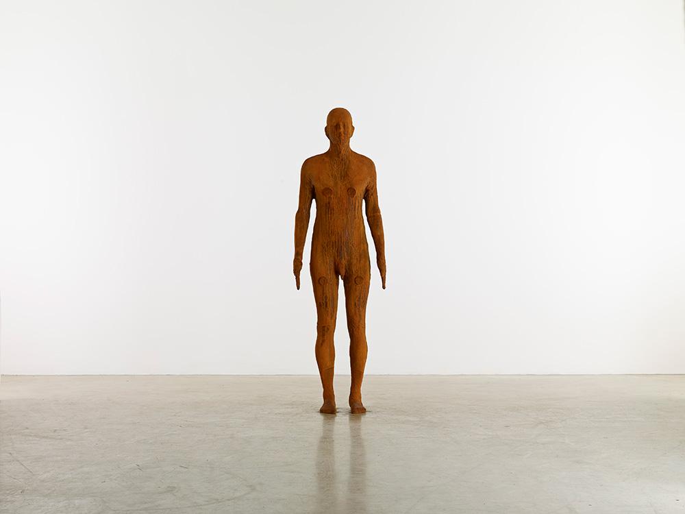 Another Time XIX comes from Gormley’s final pose in the series and is one of an edition of five. Each figure later develops its own patina, making all of them unique. This example has a rich orange-gold rust, with a pattern of striations made by placing the figure in the rain.