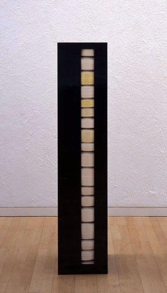 Eighteen thrown porcelain vessels in six different glazes placed in a laser cut steel case created by the sculptor Alex Goacher. De Waal often plays with hiding part of the pots and in this work he encloses them in a steel frame so they can only partly be seen. The title Arcady refers to a painting by Nicolas Poussin, The Shepherds of Arcadia, at Chatsworth where De Waal worked in 2006-2007. He used the sense of beauty and confinement which he found in the painting as inspiration for Arcady. This work shows an important change in the artist's direction and the Crafts Council can now lend this work for exhibitions alongside De Waal's earlier domestic pieces already in the collection.