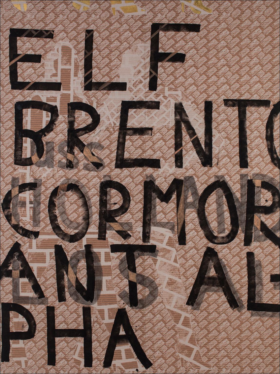 Ardyne Point is a painting made on a woven textile panel by Caragh Thuring. The outlines of two women can be seen emerging from the brickpatterned background, with the words ‘Elf’, ‘Brent’, ‘Cormorant Alpha’, ‘USS Holland’ and ‘Los Alamos’ painted over them in capital letters. Thuring studied fine art at Nottingham Trent University and lives and works in London. She first became known for her large figurative paintings made on untreated linen, often with large areas of fabric left bare. In her recent work Thuring has adopted a process of painting on to canvases woven with images of her previous pictures. The woven surface in Ardyne Point replicates an earlier work by Thuring, while the title refers to a former oil rig construction yard in Scotland. Cormorant Alpha is an oil rig that was built at the site, and USS Holland refers to a tender that serviced nuclear submarines during the Cold War on the Holy Loch in Scotland, and Los Alamos was a dry dock for those submarines. The Arts Council Collection is a loan collection of modern and contemporary British art and Ardyne Point is the first work by Thuring to join its holdings.