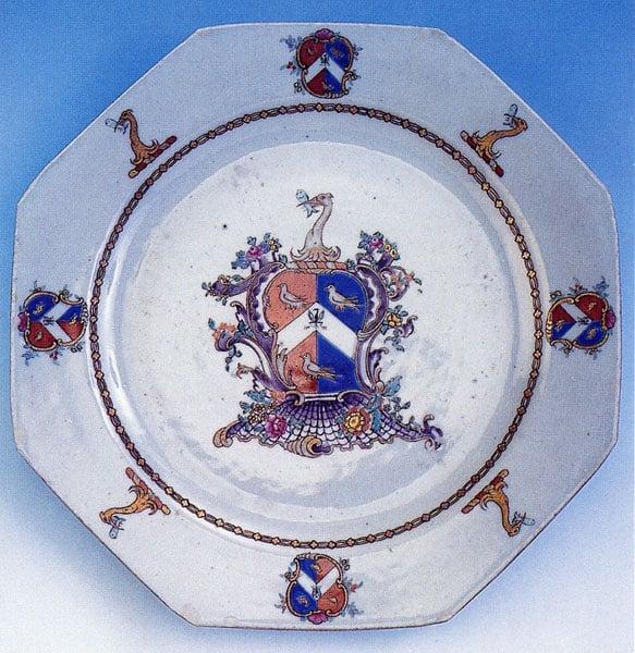 This octagonal Ch' ien plate is an excellent example of the service of Chinese armorial porcelain most probably commissioned by Alderman Beckford, father of William Beckford. Beckford Senior was Lord Mayor of London in 1763 and again in 1770. The arms and crest of Beckford are repeated four times around the rim of the plate.