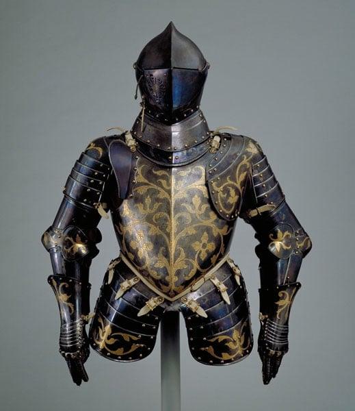 Armour of the elector Christian I of Saxony. Foot jousting armour, originally a set of 12, but only 6 left. No leg harness, as intended for fighting on foot at the barriers. Surface is blued and decorated. Marks on helmet show considerable use.